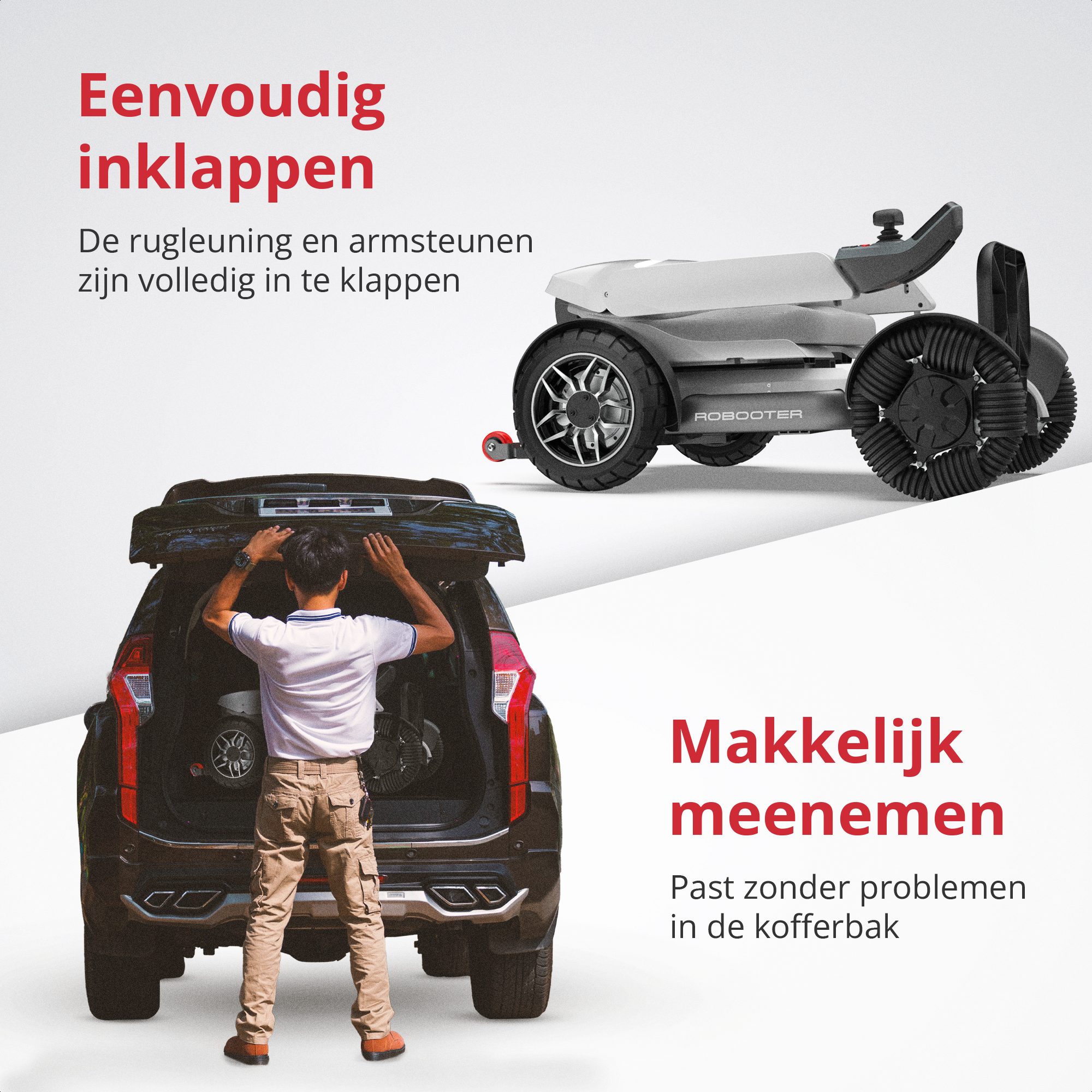 De IVA Robooter X40 is speciaal ontworpen voor gebruiksgemak en flexibiliteit. Dankzij het elektrisch opvouwbare mechanisme, kan de rolstoel met één druk op de knop of via de app worden ingeklapt, wat hem ideaal maakt voor transport en opslag.