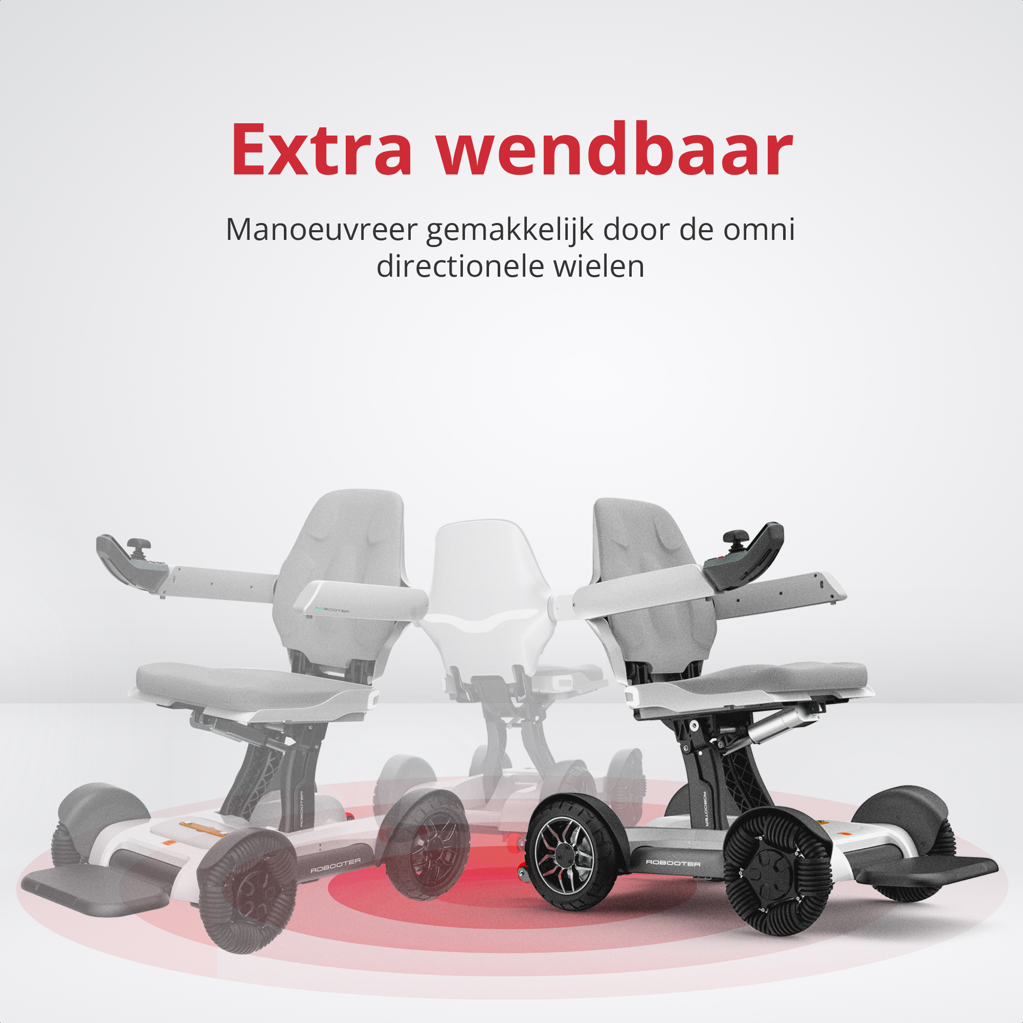 De Robooter X40 is bovendien zeer wendbaar, dankzij de omnidirectionele wielen, die soepel en moeiteloos draaien in kleine ruimtes. Dit maakt de rolstoel perfect voor gebruik binnenshuis en in smalle doorgangen.